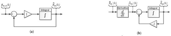 Assuming that the speed and angle obtained from the sensor provides the best low-frequency response (closest to the true angle and speed) and the worst high-frequency response (high-noise contribution), a correction step should be applied that ensures the observer tracks the low-frequency response of the sensor (the true angle) while including the low-noise (high-frequency response) of the estimation (). This should be enabled by the correction loop in the observer. Applying the superposition principle to the correction loop in Figure 5 and including the a priori estimate of the angle into the output with respect to estimation loop, the two loops can be derived (Figure 7).