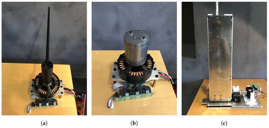 During all experiments, the motor module including test stand, T-motor U10PLUS KV80 and controller PCB (illustrated in Figure A5) are used and a DC voltage supply (TENMA 72-2640) is used to supply the motor controller PCB with 25 . All static parameters used for the experiments are shown in Table A1. The real hardware as well as all experimental setups can be observed in Figure 9. Appendix L includes a description of the electronics and software developed and implemented for the motor controller.