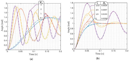 Measured (dashed lines) and simulated (solid lines) results from eight experiments (listed in Table A2) conducted on the active impedance controller. The spring constant is varied in (a) and the damping constant is varied in (b). The measured results are offset and scaled to match the amplitude and start angle of the simulated.