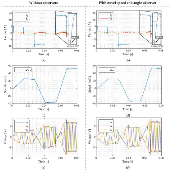 Measured and estimated results from two conducted experiments using speed mode with a single step in speed reference with zero load—without observer (a,c,e,g) and with both the novel angle and speed and the Kalman/Luenberger observers (b,d,f,h). Both speed estimations and are filtered with the same low-pass filter including a 3 dB bandwidth of 200 for better performance visualization.