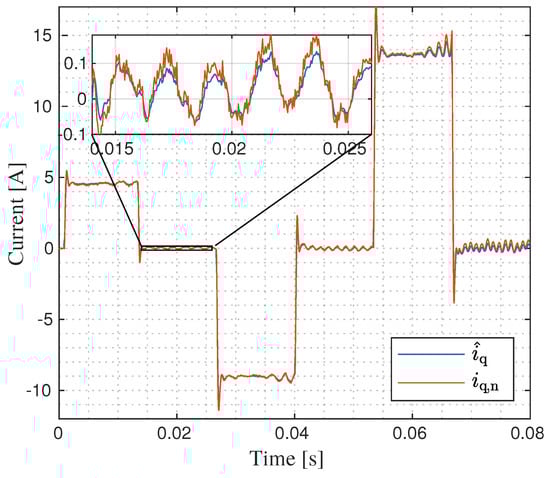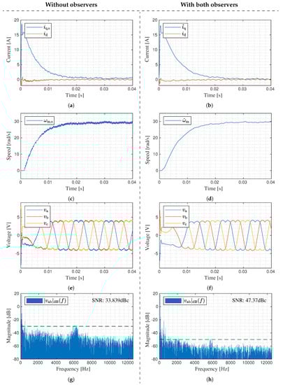 The effect of both observers on noise is consistently noticeable on all collected data. Figure 14g,h quantify a significant reduction in noise of approximately dB which corresponds with almost five times reduction. However, a small deviation occurs in the dynamic response of speed and the quadrature current which could be a result of small inaccuracies in the torque observer model.