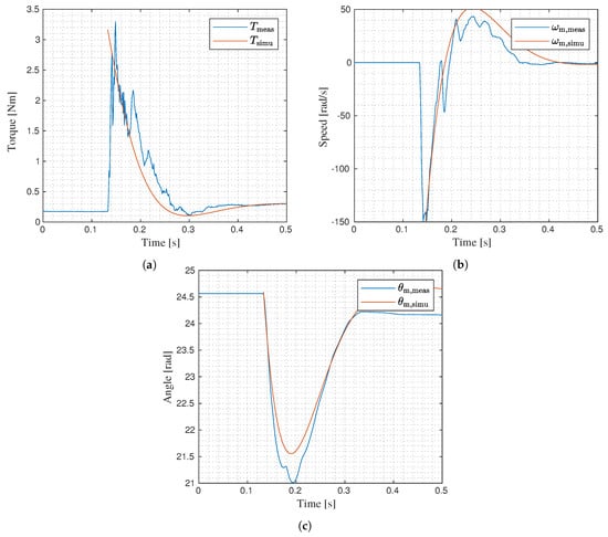 Measured and estimated results from two conducted experiments using torque mode with multiple step in torque reference with zero load—without observer (a,c,e) and with the novel angle and speed observer (b,d,f). The torque rise times are depicted on (a,b). Both speed estimations and are filtered with the same low-pass filter including a 3 dB bandwidth of 200 for better performance visualization.