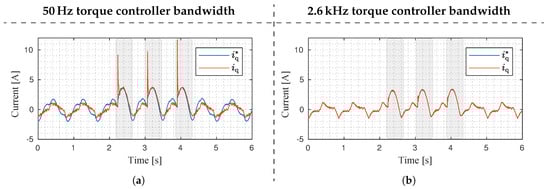 This experiment is conducted to show the results from deploying the novel angle and speed observer described in Section 4. The experiment is conducted under zero load as this results in high torque specific acceleration. This demands a lot from the observer, especially in terms of stability and accuracy. The motor controller is configured to run with torque control and a multiple torque reference step profile is applied. The results are shown in Figure 11. The torque rise time of about 133 , depicted in Figure 11a,b shows that high-bandwidth (approximately ) is accomplished while relatively low overshoot occurs, verifying high robustness. This bandwidth is not as high as the torque controller bandwidth in the MIT Cheetah Mini ( ) []. The main reason for this is that the MIT Cheetah Mini is using the STM32F446 microcontroller, which enables twice the clock frequency than the TMS320F28069 (used in this project). Therefore, MIT are capable of running the controller loop at a sample rate of 40 whereas 25 is used in this work. However, the controller design proposed in this paper can deliver approximately the same bandwidth in relation to sample rate as enabled in the MIT Cheetah Mini. It must be emphasized that this bandwidth can be adjusted by adjusting the phase margin, where 60 is used in this case to enable highly robust control. A large noise reduction can be observed in the speed , direct current and phase voltages. As quantified by the noise analysis (Appendix J), using the noise-reduced estimated electrical angle greatly reduces the noise appearing in the direct-current which then reduces the noise on the phase voltages. It should be emphasized that the effect of the noise reduction is even more noticeable when using active impedance control and/or back-EMF feedforward. The reason for this is that the noise is then amplified (based on the speed calculation) and afterwards injected into the system (based on the high-bandwidth torque control).
