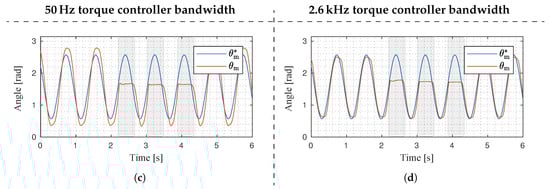 , , B, J, , and are the mechanical angle, load torque, motor damping constant, moment of inertia of the rotor, active impedance controller integrator time constant and motor torque constant, respectively. Comparing the coefficients between Equations (1) and (2) reveals the analogies depicted in Table 1.