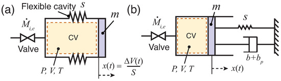 The actuator with h = 0 W/K, b = 21.5 N-s/m, k = 6.8 kg/s-Pa ± 20%, = 21.8 cc, s = 3050 N/m, m = 0.18 kg, and clearance volume =0.01 are treated as the reference. These numerical values are experimentally determined [9,10]. = 295 K and = 93.4 kPa are the ambient and standard conditions.