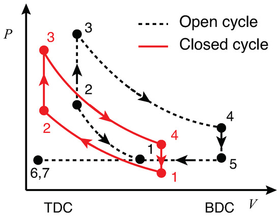 To generate a pressure-volume diagram, the model Equations (7)–(10) is numerically integrated in the order 1→2→3→4→5 →6→7→1 (Figure 2) starting with state 1: . The resulting volume , pressure , and temperature from the compression process, 1→2 is computed by integrating Equations (7)–(10) from the initial condition for a time such that the piston velocity . The resulting volume , pressure , and temperature during the heat addition process, 2→3 is computed from Equations (8) and (9) by assuming it to be instantaneous ( and ). The volumes, pressures, and temperatures ; ; and from the expansion 3→4, exhaust (displacement phase) 5→6, and intake processes 6→7→1 are computed by integrating Equations (7)–(10) from the initial conditions ; ; and for times , , and respectively such that the piston velocity and . The times , and are unknowns and are determined during the process of integration. The blowdown process 4→5 is assumed instantaneous, isentropic, and occurs at zero piston velocity () and ambient pressure (). The working fluid temperature at state 5, is determined using the adiabatic relation: