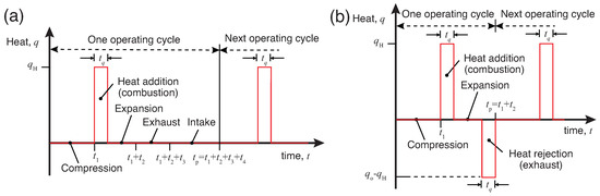 To generate a pressure-volume diagram, the model Equations (7)–(10) is numerically integrated in the order 1→2→3→4→1 (Figure 2) starting with state 1: . The resulting volume , pressure , and temperature from the compression process, 1→2 is computed by integrating Equations (7)–(10) from the initial condition for a time such that the piston velocity . The resulting volume , pressure , and temperature during the heat addition process (2→3) is computed from Equations (8) and (9) by assuming it to be instantaneous ( and ). The volume, pressure, and temperature from the expansion process 3→4 is computed by integrating Equations (7)–(10) from the initial conditions for time such that the piston velocity . The times and are unknowns and are determined during the process of integration. The heat rejection process 4→1 is assumed to be instantaneous and occurs at zero piston velocity ().