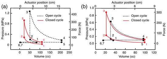 For the reference actuator, the addition of extra load (an increment by 1.5 N-s/m), results in shorter displacement strokes, and the addition of external work modeled by N-s/m during the intake process 7→1 results in significantly altering the PV diagram for the open cycle (comparing Figure 4a,b). The actuator performance metrics for the open and closed cycles are given in Table 1.