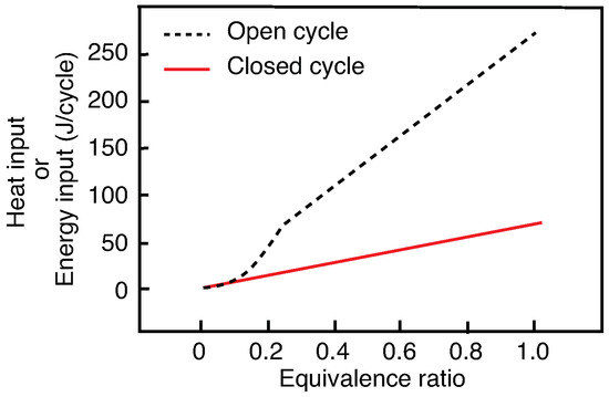 For a specific fuel, an equivalence ratio is dependent on the mass of fuel injected (or associated heat input) and the mass of air inducted into the actuator [19]. Figure 5 graphically shows the relation between heat input and corresponding equivalence ratio for the reference actuator in open and closed cycles. Each plot in the figure is obtained by supplying the actuator with varying heat, and the corresponding equivalence ratios are calculated based on the mass of air in the cavity CV at state 1. It is clear from the figure that for a fixed equivalence ratio, the amount of heat added per cycle is higher for open cycle operation compared to a closed cycle operation. Furthermore, from the figure, the closed cycle operation holds a linear relationship between the equivalence ratio and heat input, while the open cycle holds a nonlinear linear for low (< 0.23) and eventually transmutes to linear higher (> 0.23). A similar observation was reported in [10].