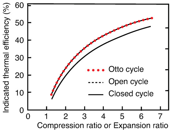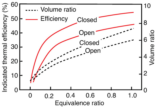 For a fixed equivalence ratio (say = 0.5), a difference of about 10% in indicated thermal efficiency is observed between the open and closed cycles (Figure 6). The higher efficiencies of the closed cycle operations are because of ignoring the pumping losses in the actuator associated with the exhaust and intake processes. Furthermore, as can be seen in figure, an increase in the heat input or equivalence ratio increases the volume ratio (ER or CR). This is because a higher heat input or equivalence ratio will result in the higher pressure at the thermodynamic state 3 (Figure 4), resulting in pushing the piston further outward and causing higher volume ratios. To compare the performance of the actuator against an Otto cycle-based engine, a plot of efficiency against volumetric ratio (CR or ER) is generated for identical physical and operating parameters (Figure 7). The Otto cycle efficiency is computed using the relation [19]. For a closed cycle, the actuator operates like an Otto cycle—same thermodynamic processes and equal compression ratio; hence the efficiencies for the closed and Otto cycle are equal for any given volume ratio. As aforementioned, the pumping losses in the open cycle results in lower thermal efficiencies compared to the closed or Otto cycles.