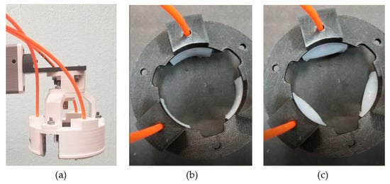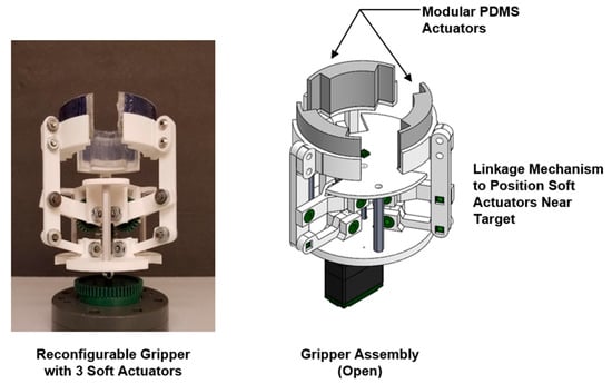 In general, pneumatically-driven expandable, soft actuators are based on the notion of stretchable elastomeric structures with inflatable air cavities that incorporate inextensible walls or surfaces that guide movement, such as active surface deformation or bending motion. Important design considerations include selecting an appropriate elastomeric material with predictable properties, developing a viable geometry for the required movement, restricting the actuator’s degrees-of-freedom (DoF) to achieve the desired contact forces, and ensuring ease of fabrication and reproducibility. The intended application also imposes constraints on the actuator design. For example, many of the biologically inspired soft, bendable actuators [2,3,4,5,6] are not suitable for horticultural applications, because the designs incorporate too many DoF and do not take into account spatial constraints imposed by the work environment. To address these practical concerns, the air-driven, soft gripper described in this paper is comprised of three modular hyperelastic polydimethylsiloxane (PDMS) actuators inserted in a closed ring assembly (Figure 1).