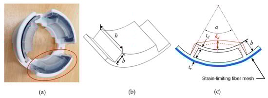 A pneumatic gripper comprised of three compact PDMS actuators (Figure 2a) was developed for grasping irregular-shaped organic objects during automated harvesting [18]. Each constituent actuator has a curved geometry (Figure 2b), with only one deformable concave wall that expands toward the center of the gripper assembly during pressurization (Figure 2c). Similar to bending actuators, the proposed design uses a strain-limiting layer to prevent unwanted deformation of the actuator’s rear surface (Figure 2c). However, there is no strain-limiting material embedded in the wall of the expandable surface. The modular single-DoF actuator is designed for functional simplicity, ease of fabrication and assembly, reliability, and repeatable performance. In addition, the design enabled a realistic model of the stress behavior to be simulated using COMSOL Multiphysics software, in order to predict the impact of the expandable wall dimensions on the gripper’s performance during air inflation.