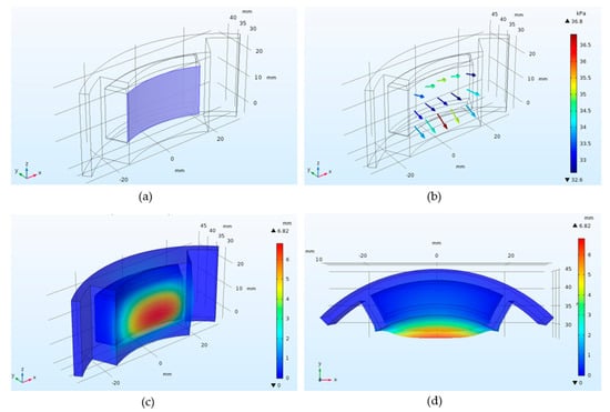 Each simulation test started with the same initial conditions, and the structure was restricted so that the applied air pressure caused only the concave wall of the chamber to deform. In addition, the timed simulations were solved for 1 s of applied pressure. The dynamics of the hyperelastic structure during inflation were not investigated in this study.