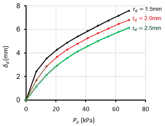 Displacement values at varying applied pressures for different thicknesses .
