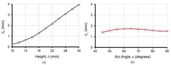 Displacement as a function of both (a) actuator height (h) and (b) arc angle (α) for and .