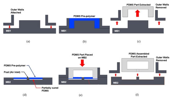 The key steps of the fabrication process are summarized in Figure 7. MB1 was first assembled by attaching the outer wall to the base and ensuring that there were no leaks along the joins (Figure 7a). Mixed PDMS prepolymer was then slowly poured into each of the actuator cavities (Figure 7b). Once filled, the assembly was placed in a vacuum chamber and fully degassed until no bubbles remained in the PDMS. After degassing the PDMS, the entire assembly was left to cure at ambient temperature for 48 h. Upon completion of curing, the outer walls attached to MB1 were removed, and the cured PDMS part was carefully extracted (Figure 7c). The bottom section of MB2 was then partly filled with PDMS (Figure 7d), degassed, and partially cured for 24 h. Typically, the thickness of the layer would be half the height of the post located at the center of MB2. The post forms the through-hole on the bottom PDMS layer, which becomes the air inlet for the assembled actuator. The process of partially curing allows the PDMS part to reach a solid state but remain bondable to another PDMS structure. To ensure a strong bond between the discrete molded parts, the remainder of the bottom section (slightly below the height of the central post) was filled with PDMS prepolymer and further degassed to eliminate bubbles in the polymer. The fully-cured PDMS part previously extracted from MB1 was then carefully aligned and placed over the uncured PDMS layer (Figure 7e). Light pressure was applied to the part in order to form a tight seal for the bonding process. To ensure that the assembly remained in place during the curing process, the outer walls were attached to the base of MB2. The completed MB2 assembly was then left to cure at ambient temperature for 48 h, after which it was taken apart and the finished PDMS geometry was removed (Figure 7f). Finally, a strip of synthetic fiber mesh was adhered to the convex surface of the actuator geometry with a thin coating of more prepolymer. This formed the strain-limiting, inextensible layer of the actuator. The synthetic fabric mesh allowed uncured PDMS prepolymer to seep through the fiber structure, fully bonding the layer to the PDMS geometry and preventing delamination.