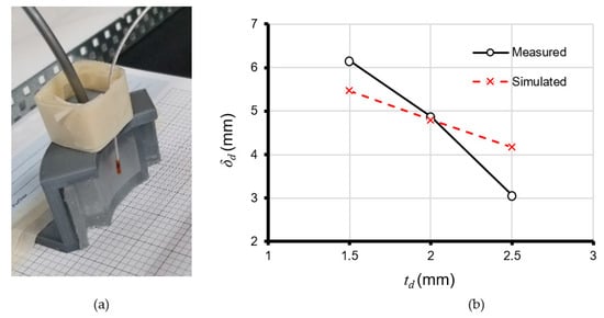 The displacement of the actuating surface was measured using a 3D Guidance TrakSTAR system [24], with an electromagnetic (EM) sensor capable of measuring 6 DOF (Figure 8a). The measurement values correspond to the distance between the sensor probe and fixed transmitter location. The displacement is, therefore, the change in distance with respect to the initial noninflated actuating surface. Figure 8b shows both the measured and COMSOL simulated displacements for the three different wall thicknesses when . Note that the measurement value is the average steady-state displacement over a 0.5 s window. The observed differences in the measured and simulated displacements are partly the result of limitations in the Mooney–Rivlin hyperelastic model, the theoretical values for the shear and bulk moduli, and the computational limitations imposed by the size of the finite element mesh used in the simulations. The smallest difference occurs at where and the largest at where . The latter case represents a ~25% error.