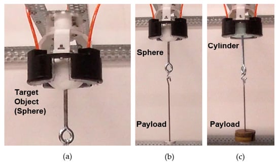 Experimental setup for payload tests. (a) Close-up of spherical target held in gripper; (b) sphere target for payload test; and (c) cylindrical target for payload test.