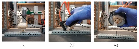 Experimental setup and manual test procedure. (a) Organic test object (i.e., mushroom) embedded on threaded rod; (b) gripper placed over mushroom; (c) gripper lifting mushroom from threaded rod.