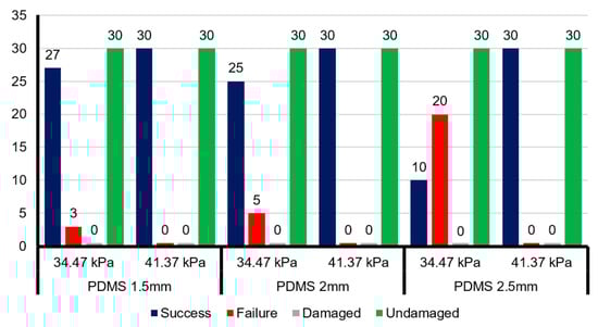 The PDMS soft actuators were assembled in three gripper assemblies with concave wall thicknesses of 1.5, 2.0, and 2.5 mm. For each gripper assembly, two sets of tests were performed with the applied air pressure equal to 34.47 kPa (5 psi) and 41.37 kPa (6 psi), respectively. A single test involved grasping, pulling, and holding 30 organic mushrooms of similar size. The experimental observations of the various soft grippers, Figure 12, indicate that PDMS actuators with performed well for both the grasp-and-hold (success/failure) and minimal infliction of surface damage (damaged/undamaged). In contrast, the gripper with soft actuators that had a wall thickness of failed 2/3rd of the grasp-and-hold tests but still did not produce any significant surface damage on the target mushroom.