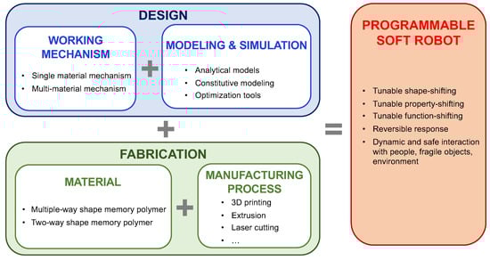 Motivated by the discussed framework, the present paper aims to give an overview about the current state-of-the-art on multiple-way and two-way SMPs and their application to programmable soft robotics. The attention will be dedicated to thermo-responsive SMPs, which are the most used and can be remotely actuated. Particularly, thermo-responsive SMPs activated through both direct and indirect heating will be discussed. The review will cover all the building blocks important for the design and fabrication of these robots, i.e., the base materials, manufacturing processes, working mechanisms, and modeling and simulation tools (Figure 1). Examples of real-world applications of soft robots and related actuators from the literature will be described and discussed, together with current challenges and future advancements.
