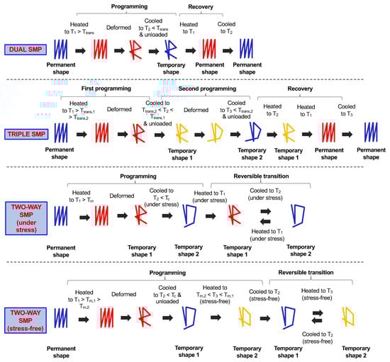 Shape memory cycle in dual, triple, and two-way SMPs. For two-way SMPs, the shape memory behavior under stressed and stress-free conditions is represented.