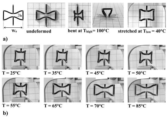 Temperature-memory effect (TME) exploited for achieving hierarchical motion of a 3D printed auxetic cell. The cell is subjected to: (a) a two-step programming consisting of an early out-of-plane bending at T = 100 °C, and a subsequent stretching at T = 40 °C; (b) shape recovery. Reprinted from [221], copyright 2020, with permission from Elsevier.