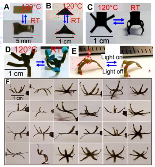 Reversible actuation of CNT-xLCE dynamic 3D structures: (A) film, (B) triangle, (C) chair, (D) “Hercules” (18.5 mg) lifts four balls (72.6 mg), (E) tripod, (F) six-petal flower. Reproduced with permission from [240]. Copyright 2016, American Chemical Society.