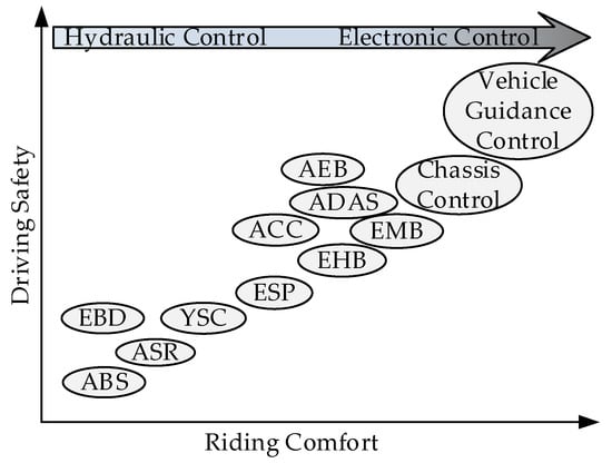 Figure 1 summarizes the development history and future trends of the braking system in terms of safety and comfort. It can be seen that the safety performance and ride comfort have been greatly improved, with the continuous improvement of braking system and the continuous integration of new features [2,3]. The additional functions, such as ABS and ESP, require additional devices, such as high-speed solenoid valves, oil return pumps, and return lines. Therefore, the structure of hydraulic brake system is becoming increasingly complex, and the maintenance is also becoming more and more difficult [4,5]. At present, new energy vehicles, such as electric vehicles (EV), hybrid electric vehicles (HEV), and fuel cell electric vehicles (FCEV), are developing rapidly and are highly concerned by major automotive manufacturers. However, most electric vehicles still use hydraulic brake system. On the one hand, the electric vehicles cannot use vacuum boosters to provide auxiliary force. The electric hydraulic pump must first be used to increase the hydraulic pressure, and then delivers the high pressure to each wheel. The electric energy needs to be converted and then transmitted multiple times in this process, so the energy utilization efficiency is not high, and there is the potential danger of brake fluid leakage. On the other hand, the hydraulic brake system cannot accurately and independently regulate the braking force, so it cannot be well matched with the regenerative brake system of EV and HEV [6].