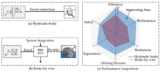 The BBW are new types of actuator that are essentially different from hydraulic brake. Figure 2 briefly illustrates the differences between the BBW and traditional hydraulic brake, as well as the performance comparison in terms of performance, modularity, driving pleasure, ergonomics, safety, and efficiency. In the hydraulic brake system, the brake actuator and brake pedal are fixedly connected by mechanical and hydraulic components, so the flexibility is poor. However, the BBW actuators are driven by separated electric motor, and cables and wires transmit the signals and energy, which greatly improves the response speed, braking efficiency, and flexibility. Therefore, BBW is superior to hydraulic brake in terms of braking performance, modularity, energy efficiency, and so on [7].