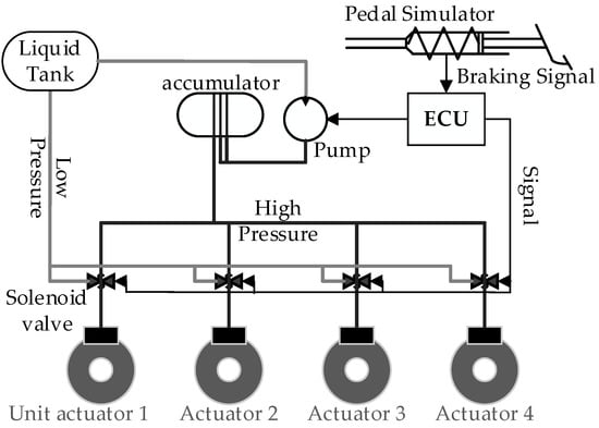 Electro-hydraulic brake (EHB) is an evolution of the traditional hydraulic brake system. It is a typical integrated system of mechanical components, hydraulic systems, and electronic control systems. Figure 3 shows the structure and composition of EHB. It mainly consists of two parts: hydraulic actuators and electronic control systems. The hydraulic actuators include high pressure accumulator, hydraulic pump, high oil pipes and low oil pipes, liquid accumulator, solenoid valves, and so on; the electronic control systems includes sensors, electronic control unit (ECU), drive motors, cables, and so on [9].