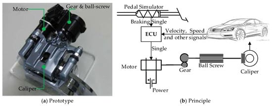 Like other X-by-wire systems in vehicles, the actuator and controller of electro-mechanical brake (EMB) are completely new designed, so that the performance of EMB is much better than EHB [15]. EMB uses a motor to provide the driving torque, uses a gear mechanism or planetary gears to amplify the torque, and uses ball-screw mechanism to convert torque into force, as shown in Figure 4 [16,17]. From the two figures, it can be seen that EMB is a new type of promising brake actuator, with the advantages of high transmission efficiency, environmental protection, and energy saving, because it completely eliminate the hydraulic components, such as hydraulic pumps and solenoid valves [18].