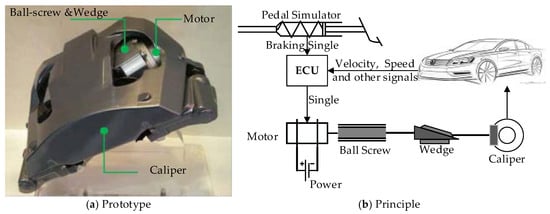 - Jo, C.H.; Lee, S.M.; Song, H.L.; Cho, Y.S.; Hyun, D.Y.; Kin, H.S. Design and Control of an Upper–Wedge -Type Electronic Brake. Proc. Inst. Mech. Eng. Part D J. Automob. Eng. 2010, 224, 1393–1405. [Google Scholar] [CrossRef]