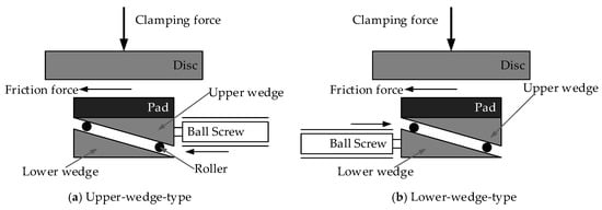 There are two types of EWB: upper wedge and lower wedge, as shown in Figure 6 [30]. In the upper wedge structure, the braking force is obtained by inserting the upper wedge, the direction of the ball screw force is the same as the friction force that is applied to the brake disc, and the friction force pulls the wedge block. Therefore, only a small force is required to control the braking force. In the lower wedge structure, the ball screw exerts the force in the direction opposite the frictional force, thus reducing the self-reinforcing effect. In addition, a large force is also required to remove the wedge from the space between the disc and roller when the wedge is stuck, so the braking process is difficult to control. In summary, the upper wedge is more practical, and most of the research is carried around it.