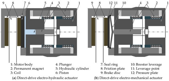 Many teams have proposed their own BBW solutions, but no one solution has become the industry’s technical consensus, as mentioned previously. Our team, combined with years of research experience, also proposed two BBW solutions that were based on linear motor technology, as shown in Figure 8. The first scheme uses the unequal-diameter hydraulic cylinder as a force amplification mechanism to amplify the thrust of linear motor; the second scheme uses unequal-arm lever as the amplification mechanism [37,38,39]. The linear motor converts electrical energy into axial electromagnetic force instead of torque, so these two schemes do not require motion conversion mechanism, such as ball-screw mechanism in EMB and EWB, thereby simplifying the structure and reducing the size [40].