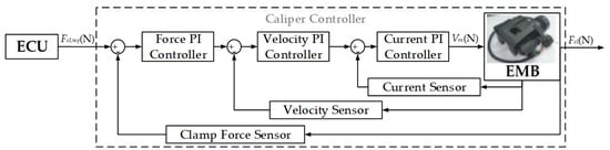 EMB and EWB are also typical three-loop systems that consist of force, position, and current. Line Chris considers that the standard three-closed-loop motion control method can meet the high dynamic requirements of EMB. For the non-linear load disturbance of braking force, the proportional integral (PI) control method of cascaded position, speed, and current are also feasible. Figure 10 shows the specific structure [65]. The outermost loop is braking force/caliper force PI controller, the middle loop is rotor speed PI controller, and the inner loop is current PI controller. For the challenges of nonlinear stiffness, actuator saturation, and load-related friction, they further used friction compensation, reverse gain scheduling, feedback linearization techniques, and motor torque prediction models to improve EMB performance [23]. In the design of the three-loop controller, the current loop is usually designed first, the speed loop is designed secondly by considering the current loop as a part of the speed regulation, and the force loop is then designed finally by considering the speed loop as a part of the force regulation loop [66].