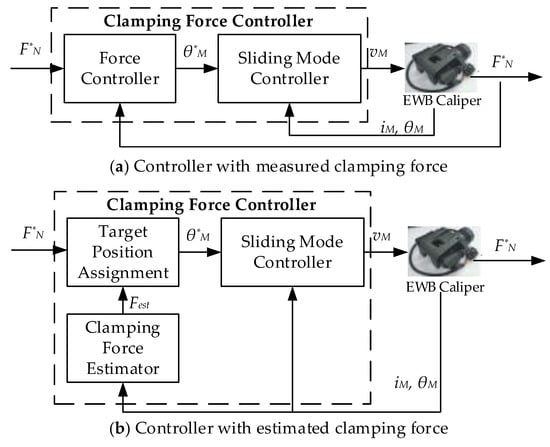 EWB is more sensitive to changes in system parameters than EMB, such as the friction coefficient and temperature variation during braking, due to the characteristics of the wedge mechanism. Park first established the nonlinear fifth-order model of EWB, and then simplified the model while using the singular perturbation method. Finally, the pseudo-sliding mode adaptive control algorithm without clamping force sensor was designed based on the reduced-order model [25]. On the other hand, the wedge mechanism has a self-energizing effect, which can effectively reduce the motor current and can even be powered by 12-voltage battery. However, the EWB cannot be practically implemented unless the self-energizing effect is effectively controlled. In response to this problem, Han proposed the sliding mode controller with two structures, one using the estimated clamping force and the other using the measured clamping force, as shown in Figure 11 [26].