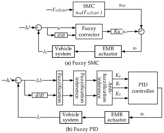 For EMB, Lindvai-Soos considered its friction as an uncertainty factor and designed a sliding mode controller (SMC) that was based on T-sum tuning rules, which compensates for frictional disturbances [62]. Lee proposed a robust near-time-optimal and state-constrained clamping force controller for EMB. The controller takes advantage of the motor capacity to achieve high closed-loop bandwidth. The time-optimal switching curve that is based on the maximum principle of Pontryagin is used as the switching surface, and the switching surface is used to schedule the control inputs based on the motor speed and positional offset. The robustness is achieved by introducing a boundary layer in the vicinity of the switching curve, which is robust and stable with bounded time-varying perturbations and modeling errors, and the tracking error asymptotically converges to the final boundary [44,69]. Peng proposed a fuzzy sliding mode controller (FSMC) based on wheel slip ratio due to the nonlinearity and uncertainty of EMB. For normal braking and emergency braking, the equivalent control law of SMC is designed according to the changes of the front and rear axle loads during braking, and the switching control law is adjusted by the fuzzy corrector. FSMC is more suitable for all types of roads with short braking distances when compared with the proportional integral and differential (PID) controller and traditional SMC [70].