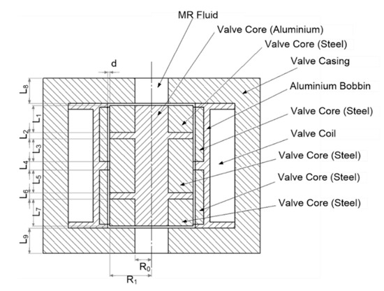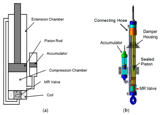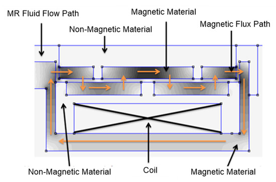The rheological properties of magnetorheological (MR) fluid can be tuned using magnetic fields. The unique rheological behavior offers various advantages that have resulted in the development of a variety of devices such as the MR damper, MR brake, MR valve, and MR clutch. These devices are called semi-active actuators as they can increase the energy dissipation only by applying external stimuli. Among these devices, the MR damper can be considered to be the most popular one owing to its successful application and penetration in the commercial automotive market. Numerous studies have identified the critical features of the MR damper, such as the controllable dynamic range of damping force, rapid adjustment response, and low energy consumption [1,2,3,4]. The initial implementation of the MR damper was in the automotive industry [5,6,7]; more recently, it has penetrated other sectors, including aerospace [8,9], marine structure [10], military [11,12], biomedical devices [13,14], home appliances [15], railway [16,17,18], and civil engineering [19,20,21]. The fundamental principle of the MR damper is similar to that of the conventional passive damper, which dissipates kinetic energy as heat through the flow restriction mechanism. The restriction of the fluid flow generates a reaction force perceived as a damping force [7,22,23,24,25]. In the conventional passive damper, the flow restriction is caused by the piston orifice acting as a fixed valve. Similarly, the flow restriction concept is utilized in the MR damper, except that the orifice is replaced by magnetically induced flow channels known as the MR valve. The purpose of the MR valve is to restrict the flow by changing the rheological properties of the MR fluid locally in the magnetic channel. The changes in the rheological properties are proportional to the strength of the magnetic field that is then induced in the magnetic channel. Thus, the flow restriction can be continuously regulated using the controlled magnetic field strength in the MR valve. As a result, the perceived damping force can also be continuously regulated or controlled depending on the intensity of the magnetic field [15,26,27].