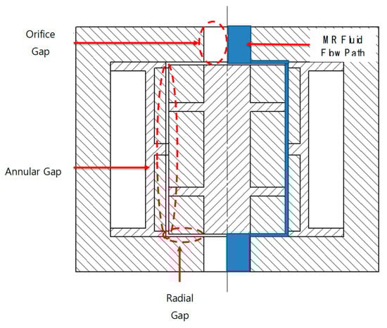 Within the damper, the valve is designed with an annular and radial construction. The orifice channel is used to attach the valve with the flow of MR fluid. Figure 4 illustrates the construction layout of the valve showing two orifice gaps, two radial gaps, and an annular gap. As the orifice gaps on the underside of the valve are significant, the changes to the valve resulting from the reduction in pressure are not substantial, and therefore the results can be omitted for the MR valve analysis. The blue-shaded area shown in Figure 4 indicates the MR fluid flow path in the valve. As the valve construction utilizes the annular and radial structure, all the mathematical equations must be combined to obtain the general equation of MR damper. The following equations represent the mathematical expressions of the viscous pressure drop and field-dependent pressure for the annular flow path.
