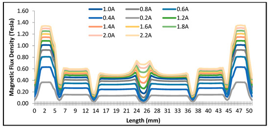 In order to design the magnetic circuit of an MR damper, the magnetic flux density is analyzed to determine the effective magnetic area. The distribution of the magnetic field strength of MR damper needs to be numerically simulated because it is challenging to measure the magnetic field strength experimentally. For predicting the MR effect on the serpentine flux with the concentric valve, numerical magnetic analysis is performed in this work by adopting commercial finite element software (FEMM software). To obtain the results, several parameters are established to conduct the simulation. The coil is designed with 800 turns of 26 AWG copper wire with a total resistance of 5.5 Ω. According to the technical specification, the maxim current that can be applied to the wire is 2.2 A, and hence, the power consumption of the MR damper will be 26.62 W. The two-dimensional axis-symmetric meshed model associated with FEMM software is used. Moreover, in this analysis, the triangular element of 16905 is generated, and the total node of 8623 is employed. Figure 6 illustrates the meshed model and the distribution of the magnetic field intensity. The permeability of the magnetic material follows the B–H curves of AISI 1020. Figure 7 shows the results of the simulated magnetic flux density of the valve along the fluid flow path. It is evident that the magnetic flux density increases as the input current increases. The variation of the magnetic flux density results from the presence of the serpentine flux path in the valve as the annular zone. The highest flux density can be observed in the radial zone of the valve; it is approximately 1.3 T at a 2.2 A current input. The second-largest density occurring in the annular flow exhibits approximately 0.7 T at 2.2 A current input. Owing to the divergence of the magnetic flux density, the lowest average is obtained at the area where no magnetic flux flows along the flow path. The magnetic flux density will be used to determine the yield stress of the MR fluid. The effective area will be affected by the magnetic field strength that is generated by the current input. The MR fluid exhibits distinct characteristics of the yield stress when the magnetic field is applied to the domain of the MR fluid. In this study, the polynomial equation of MRF-132DG, from the Lord Corporation [43], is used and represented by the following equation: