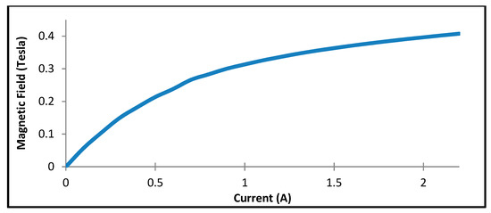 Given that there are variations in the magnetic flux density along the effective area, the estimated yield stress in each zone will vary. Therefore, the calculation for predicting the pressure drop is conducted with a different region. Figure 8 illustrates the curve conversion of the valve, wherein the correlation between the applied current and magnetic field generated along with the valve considering the average of the total magnetic flux density is illustrated. The graph shows the increasing trend when the input current applied to the valve increases. From the graph in Figure 8, the polynomial equation for the yield shear stress of the new MR damper can be expressed as follows: