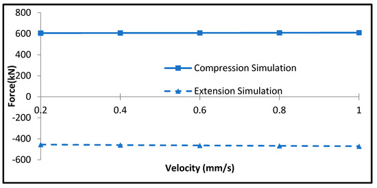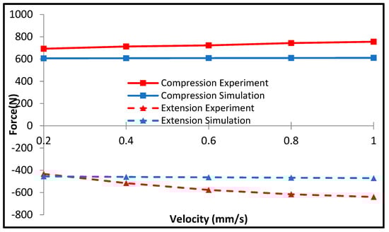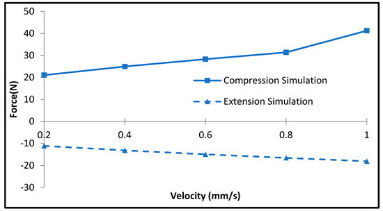 Figure 9 shows the variation in the simulated damping force with that of the piston velocity in the off-state condition (without input current). The simulation results are obtained using Equations (11)–(14). It is identified from this figure that the damping force of the MR damper at off-state condition is approximately 41 N for the compression side with the velocity 1 mm/s, whereas it is approximately 18 N for the extension side. It is evident that the damping force increases as the piston velocity increases, as expected from Equation (10). Figure 10 presents the simulated damping force in the on-state condition with an input current of 0.3 A. It is observed that the effect of the piston velocity is highly marginal, and hence, the damping force is almost constant regardless of the piston velocity. Thus, the damping force owing to the input current is dominant. It is observed from the figure that the damping force of the MR damper with 0.3 A is approximately 610 N for the compression side with a velocity of 1 mm/s, whereas it is approximately 470 N for the extension side. It is noted here that lower current input is chosen for the comparison due to the discrepancy in the data that later will be shown during the experiments.