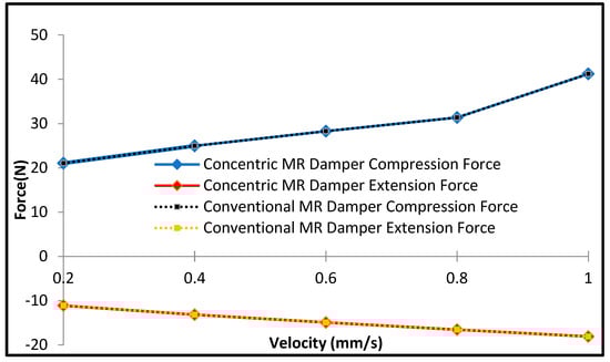 Figure 11 and Figure 12 show the off-state simulation damping force and the on-state simulation for the conventional MR damper and concentric MR damper, respectively. As is evident from Figure 11, the off-state results for the concentric MR damper and conventional MR damper are similar, as identical valve sizes are used for the two dampers, and the friction and accumulator forces are omitted in the model. However, for the on-state (0.3 A) simulation, the concentric MR damper produces a higher damping force than that of the conventional MR damper for both the compression and extension sides, as shown in Figure 12. This is because the concentric valve structure has a more significant number of coils turns than the conventional one under similar space constraints, as discussed in the previous section. It is noted here that in this simulation, the accumulator is set to have a pressure of 7 bars, which is similar to that for the measurement. The result shown in Figure 12 directly indicates the higher dynamic range of controllable damping force of the proposed MR damper compared with the conventional MR damper of compact size. This will be a significant benefit in the actual applications of MR damper. It is noted here that in this comparative work, the MR damper with the piston bypass valve is not considered since it has a bulk structure, a much larger volume size than the two types compared here.