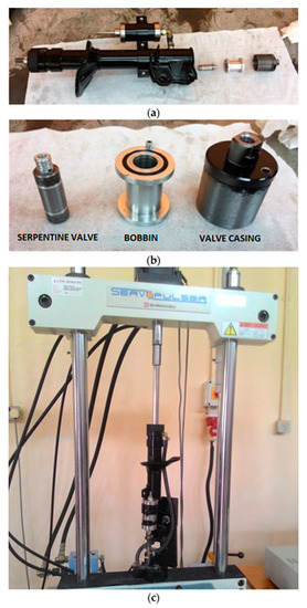 The validity of the analytical model was verified using the measurement of the fabricated prototype shown in Figure 13. The valve was fabricated with dimensions similar to those discussed in the previous section, and the fluid domain was filled with MRF-132DG supplied from Lord Corporation [43]. Figure 13a presents the breakdown of the MR damper, and Figure 13b shows the components breakdown of the valve system. The performance test was conducted by installing the MR damper in the dynamic test machine (Shimadzu EHF-L series) as shown in Figure 13c. The available measurement data from the machine are the rod displacement and the reaction force from the damper that is transferred to the host computer. Later, the logged data were then capable to be saved and analyzed outside the host computer.