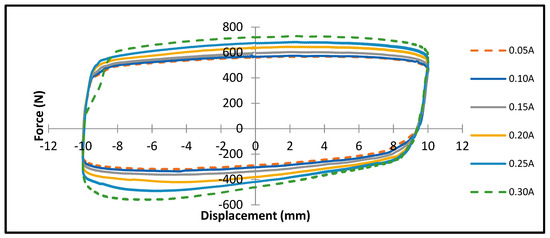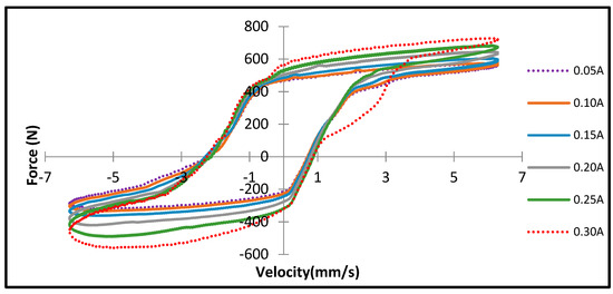 Figure 16 presents the plot of the damping force versus the piston velocity at various input currents. The velocity is set to 6 mm/s with a sinusoidal loading and with various currents applied with an increment of 0.05 to 0.30 A. The maximum damping force reaches up to 750 N for the positive velocity side and up to 600 N for the negative velocity side when the current input applied is 0.30 A. In the positive velocity side, the damping force reaches up to 550 N at 0.05 A, whereas it reaches up to 250 N in the negative velocity side.