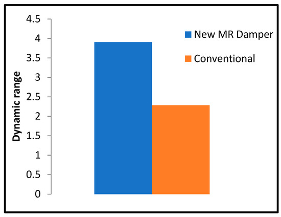 Most of the MR damper is evaluated based on the dynamic range that the damper could produce. The dynamic range is defined as the ratio of the peak force with a maximum current input to the one with zero current input. A larger number of dynamic ranges indicates a higher value of the control range for the MR damper. The dynamic range equation is shown as follows [42]:
