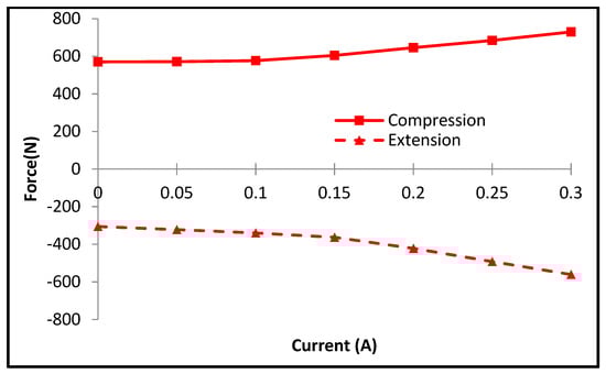 Figure 18 shows the relationship between the current input and the maximum damping force generated under the fixed velocity of 1 mm/s. It is observed that the damping force gradually increases as the input current increases. The increment speed of the damping force with respect to the input current is not high, unlike many results of the field-dependent damping force [44,45]. This is owing to the low level of the applied current. In general, the damping force sharply increases as an input current over 1 A is applied to the MR fluid domain [44]. As remarked at the end of the conclusion, the study on the damping force controllability, which is directly related to the response time of the damping force to the input current, will be undertaken as future work.