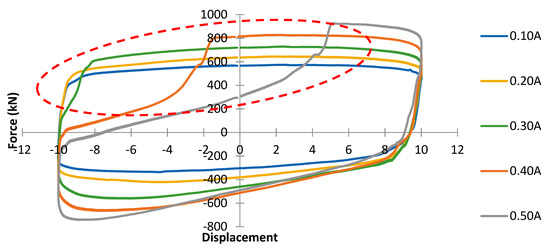 The primary goal of the experiment is to evaluate the damping characterization of the new concentric MR damper. The measured performance of MR damper is only up to 0.1 Hz in this study to avoid any degradation of the piston seal due to problems in the accumulator. The excitation frequency limitation is also the main reason why the effective maximum current input in the MR damper only reached up to 0.30 A. Ideally, the accumulator should have a much higher force to move the floating piston than the damping force produced by the throttling valve. However, in this experiment, the accumulator force was only around 750 N, which was only exceeded when the applied current input was higher than 0.30 A. In this experimental work, the accumulator is set to have a pressure of 7 bars, which is lower than that of the typical MR damper [44]. When this occurred, the blocking force generated by the throttling valve will be higher than the force of the accumulator and temporarily creates a more apparent elastic effect as the force–displacement curve will have a more visible slope. This phenomenon occurs during the measurement, as shown in Figure 20, when the damper experiences compression and the valve excitation current is 0.3 A and above. As the excitation current increases, the valve pressure drop increases as well and the blockage force from the valve might be higher than the elastic force from the accumulator. In this situation, the fluid will be forced to flow in two stages. The first one is when the fluid is forced to the accumulator until the accumulator reaches full capacity, which is reflected in a steeper slope in the force–displacement curve. The second stage is after the accumulator reaches full capacity; the remaining fluid will be compressed to a higher pressure and surpass the blockage force from the valve to flow to the other chamber. These situations also create a void-like effect during extension that deteriorates the damping characteristics, as shown in Figure 20 (dashed line circle). This phenomenon is not preferred in a damper, as the ideal damper should predominantly act as a damping element without a spring effect. As a solution, the amount of volume compensation by the damper should be minimized, whether by reducing the diameter of the rod or utilizing a double rod configuration.