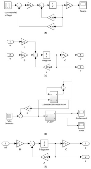 An LQR controller having the Luenberger observer of Figure 2b was designed and used for the closed-loop simulation and it is shown in Figure 2c. The estimated state x’ generated by the Luenberger observer was fed back through the LQR controller gain K to be compared with the commanded voltage. The close-up of the plant model of Figure 2b is used together with LQR observer and is shown in Figure 2d.